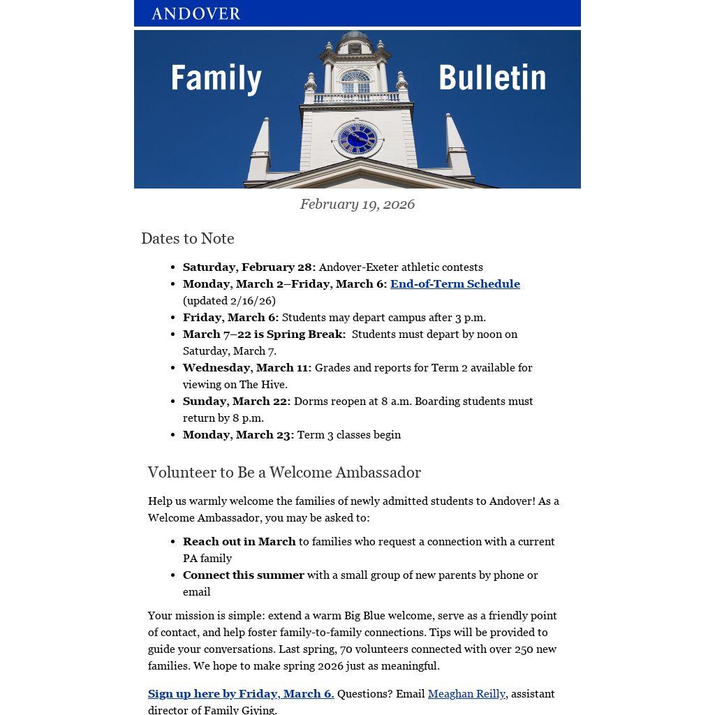 You received this message because you are a valued member of the Andover community. We are obligated to communicate with you, and require you to be on our email list while your student(s) attends Phillips Academy. For more information contact the Dean of Studies Office.