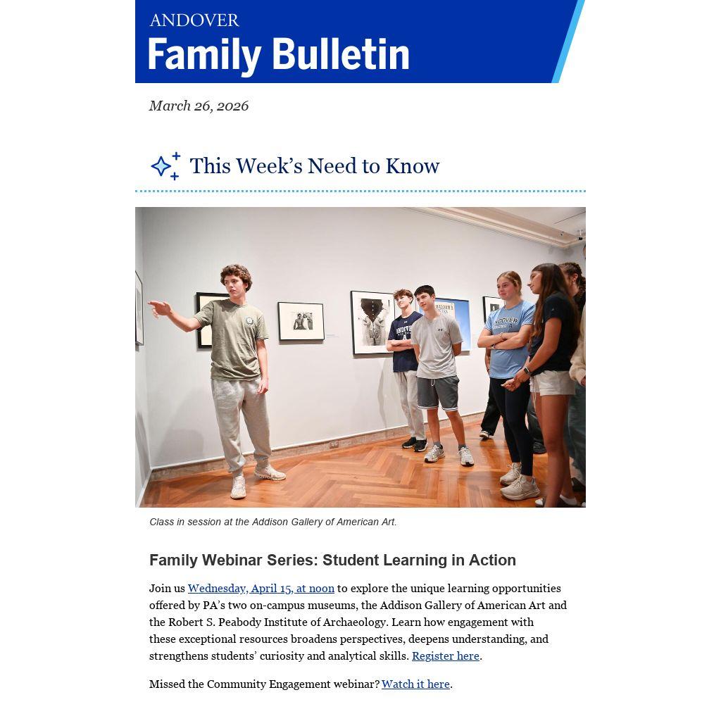 You received this message because you are a valued member of the Andover community. We are obligated to communicate with you and require that you be on our email list while your student(s) attends Phillips Academy. For more information, please contact the Dean of Studies Office.