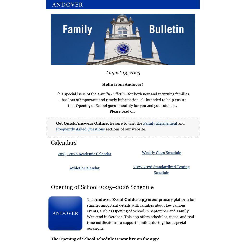 The Andover Event Guides app is our primary platform for sharing important details with families about key campus events, such as Opening of School in September and Family Weekend in October. This app offers schedules, maps, and real-time notifications to support families during these special occasions.