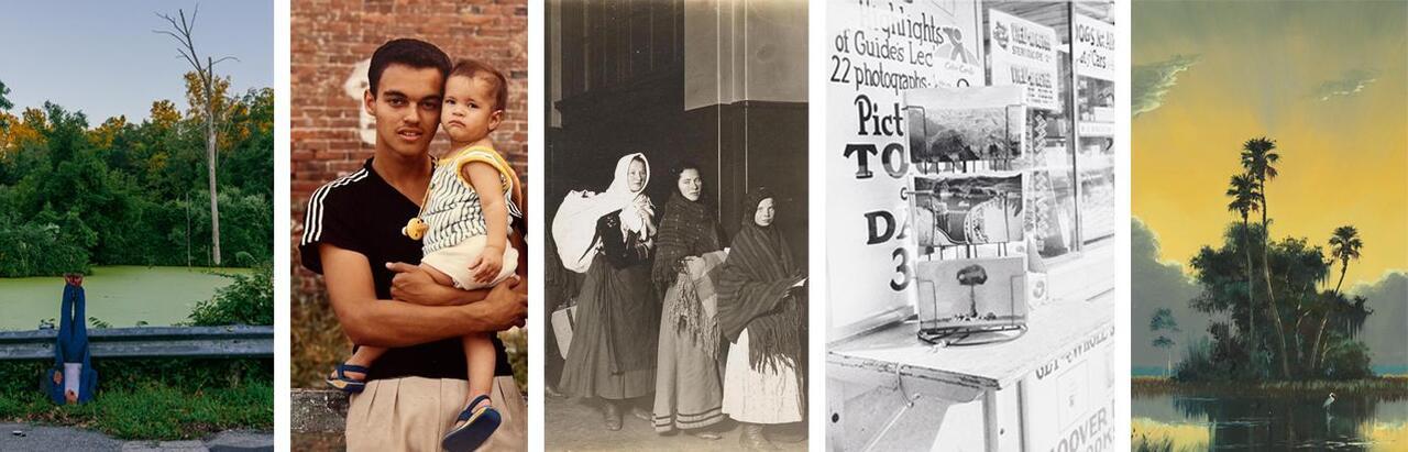 From left: Tommy Kha, Constellations XXIV, Verplanck, New York (detail), 2024. Archival pigment print. © Tommy Kha; Bill Ravanesi, The Four Vega Brothers, Holyoke, MA (detail), 1982. Chromogenic print, 16 x 20 inches, gift of the artist, 2025.59; Lewis Wickes Hine, Women at Ellis Island (detail), c. 1910. Gelatin silver print, 6 5/8 x 4 5/8 inches. Museum purchase, 2012.14; Robert Frank, Hoover Dam, Nevada (detail), 1955, print later. Gelatin silver print, 12 3/16 x 7 15/16 inches. Gift of Hart Leavitt, by exchange, 1995.9; Harold Newton, River Grass, c. 1970. Oil on board, 24 x 48 inches. Collection of Jonathan Otto (PA 1975, P 2024, 2027)