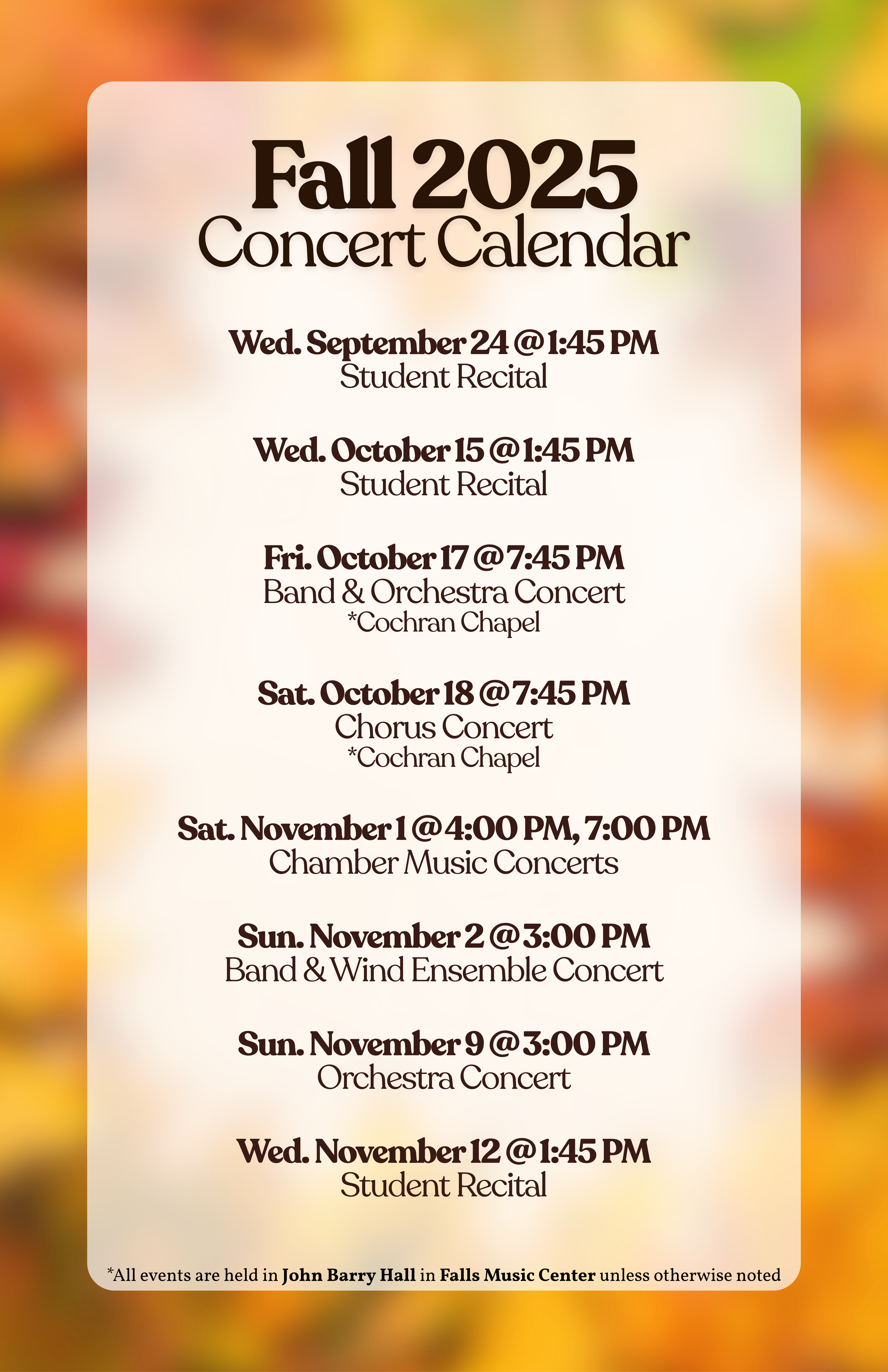 Don’t miss two Family Weekend concerts being held in Cochran Chapel that will feature our remarkably talented student musicians: