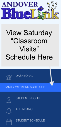 Saturday “Classroom Visits” schedule: Schedules for Saturday morning’s Classroom Visits are available online in BlueLink. Simply log onto The Hive and click BlueLink near your student’s photo. The Family Weekend Schedule is available on the entry page. To expedite campus check-in, consider taking a snapshot or screenshot of the schedule and storing it on your phone—or bring a printed copy with you.